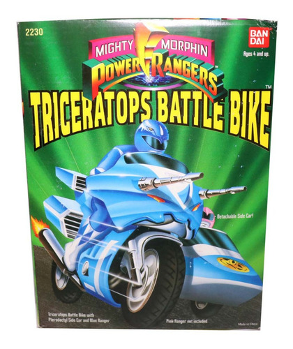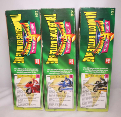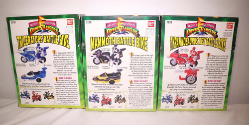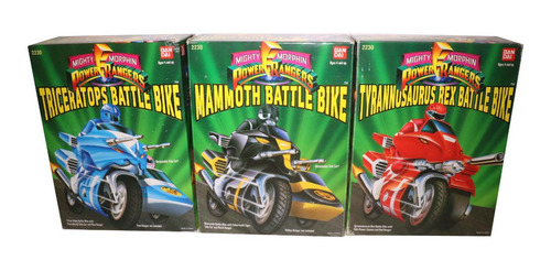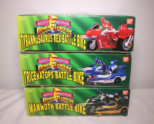 Coleção completa das Battle Bikes fabricadas pela Bandai em 1993. Os itens estão em bom estado de conservação e na caixa, porém falta um canhão da moto vermelha e um dos dois da azul. Essa coleção é formada por 3 rangers e suas motos e cada moto tem outra parte que se acopla as suas laterais.