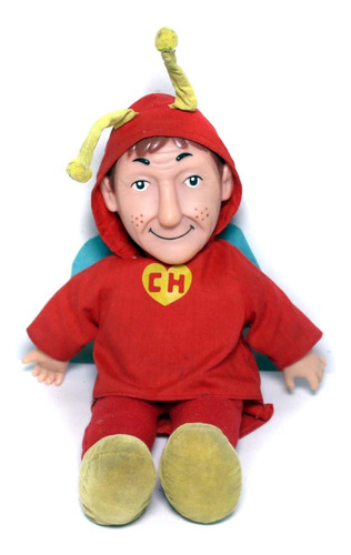 Boneco raro com cabeça de vinil e corpo de pano. Originalmente ele possuía um auto falante na barriga que fazia som, mas está sem. Não há informação de nome de fabricante.
