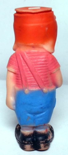 BONECO BOOTLEG MEXICANO ANTIGO BASEADO NO MODELO ORIGINAL DA MARCA VINILOS ROMAY. ELE DE BORRACHA, PINTADO COM CORES DIFERENTES DAS ORIGINAIS. VOCÊ PODE PINTA-LO DAS CORES CORRETAS SE DESEJAR. APESAR DELE TER UM APITO NA CABEÇA, AO APERTA-LO NÃO FAZ SOM.